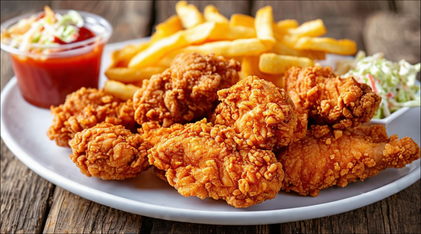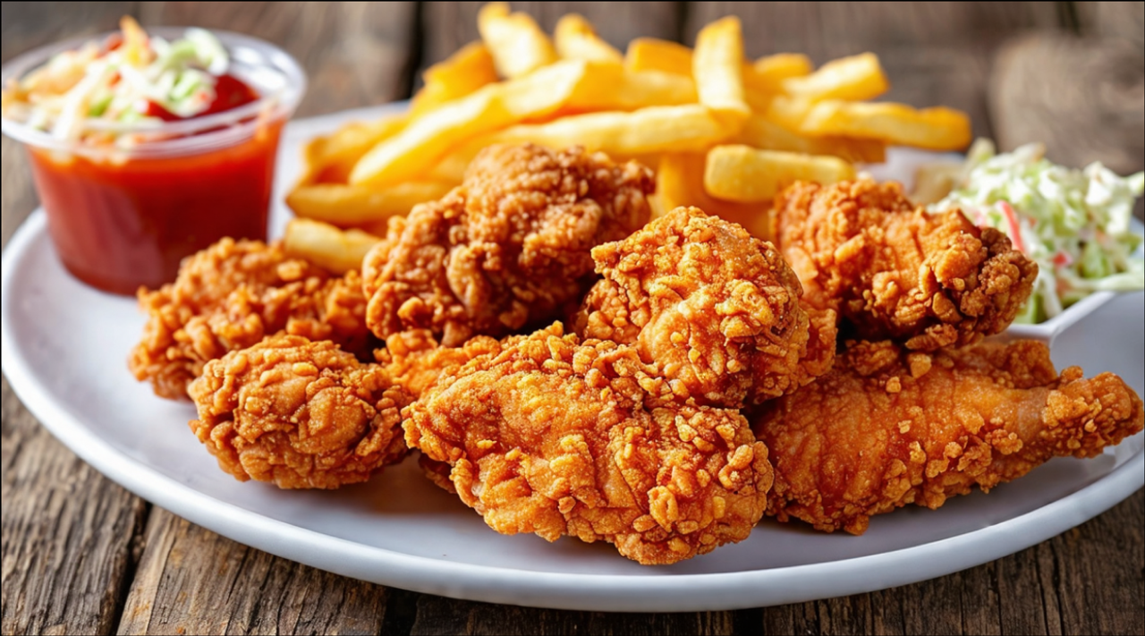 A classic fast-food dish featuring fried or roasted chicken served alongside fried potato chips (fries).