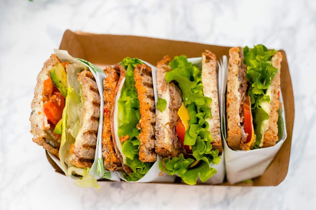 Пълнозърнест хляб с жив квас, гриловано пилешко филе, чедър, домат, зелена салата, домашна майонеза без яйца, хумус.Всички сосове и пасти се приготвят от нас и не съдържат изкуствени подобрители, оцветители, захар, млечни продукти