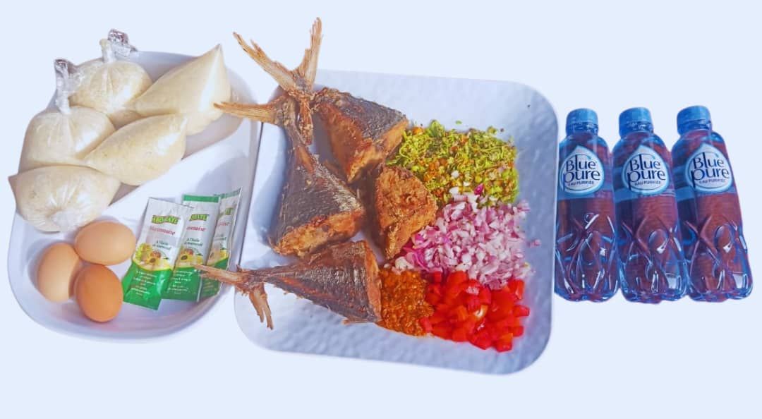4 gros morceaux de thon frit, 5 boules d'attiéké, 3 oeufs durs, 3 sachets de mayonnaise, 3 petits bidons d'eau, condiments frais