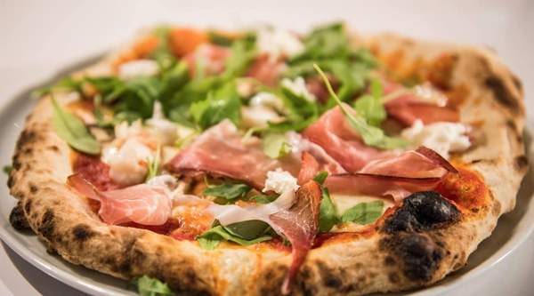 Salsa pomodoro, mozzarella fior di latte, champis, langostinos, jamón curado speck, rúcula, mozzarella fresca