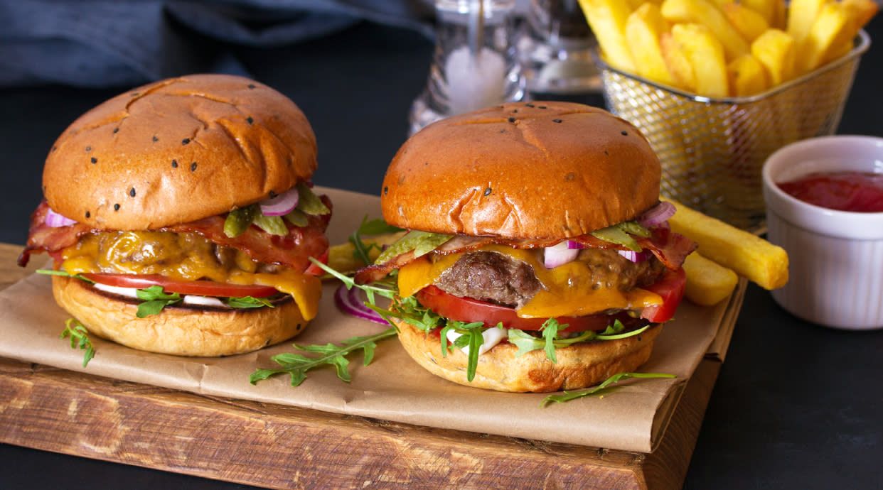 Doble smash burger (180 g.) 100% vaca española, bacon, doble queso cheddar y salsa de queso. Acompañada de patatas