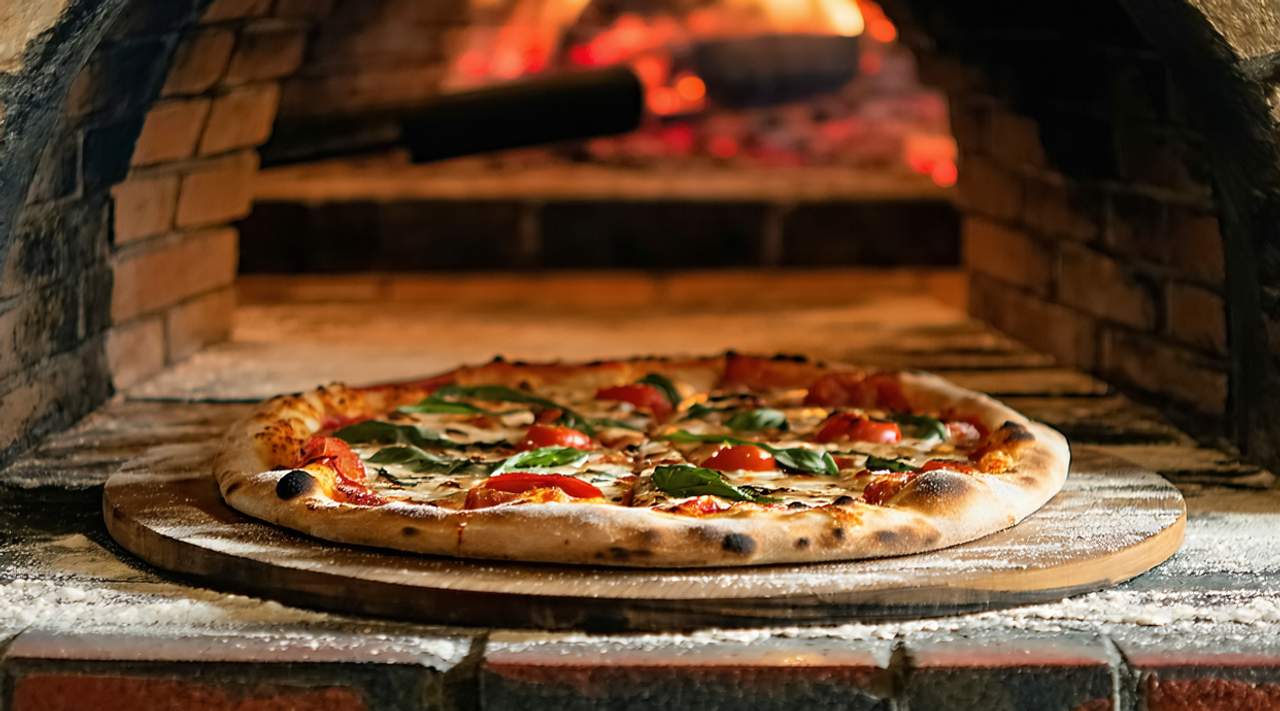 Pizza con tomate, mozzarella fior di latte, jamón ibérico, tomates secos y parmigiano