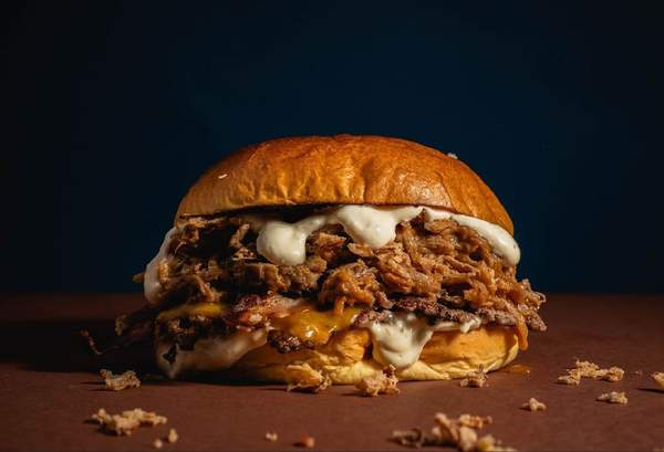 Acompañada de nuestro pan brioche, hamburguesa de dos carnes smasheadas en la parrilla, con aros de cebolla crujiente, rúcula, queso cheddar, bacon, salsa sriracha y barbacoa, un poco picante