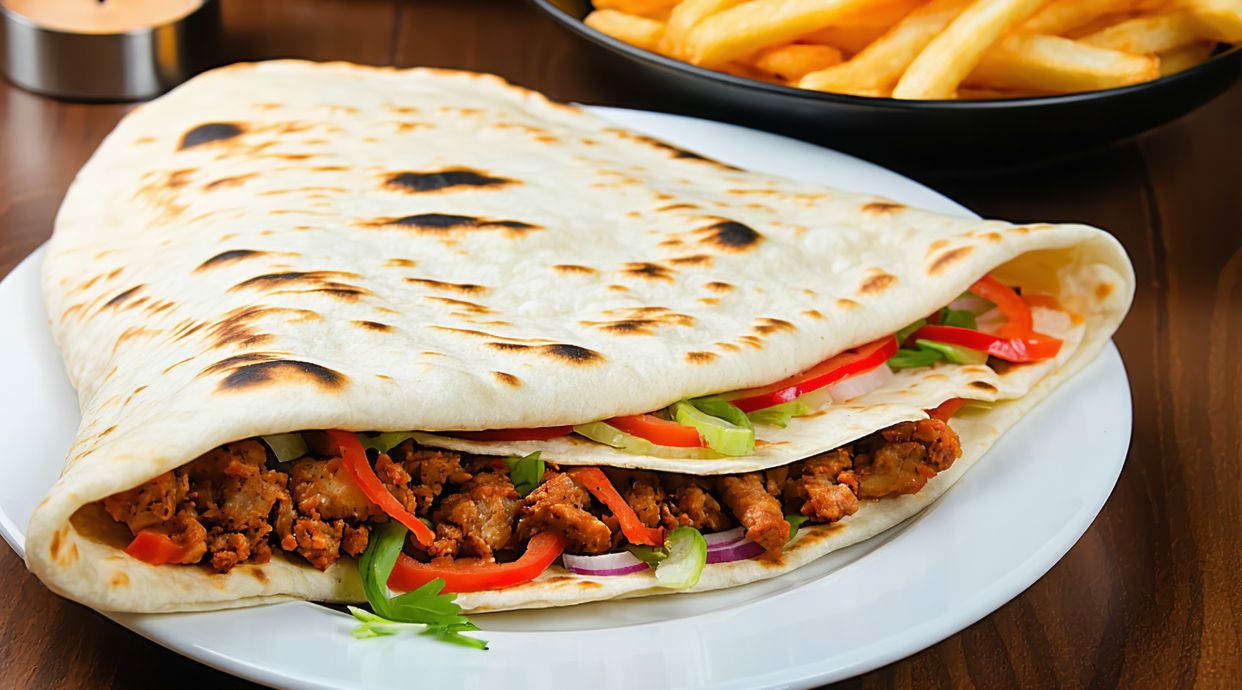 Carne de kebab con queso fundido, vegetales y salsa, enrollado en pan fino