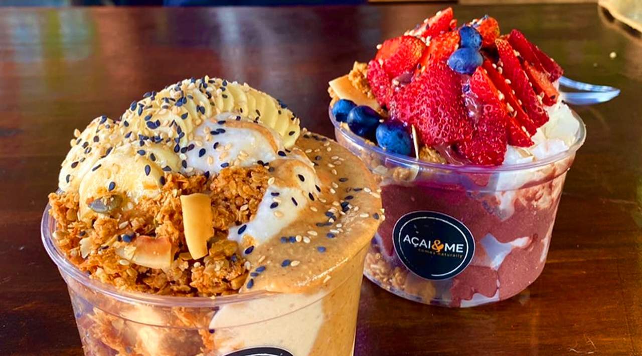Contiene: Base: plátano, açaí orgánico Toppings: granola casera, plátano, arándanos, semillas mixtas y mantequilla de maní casera