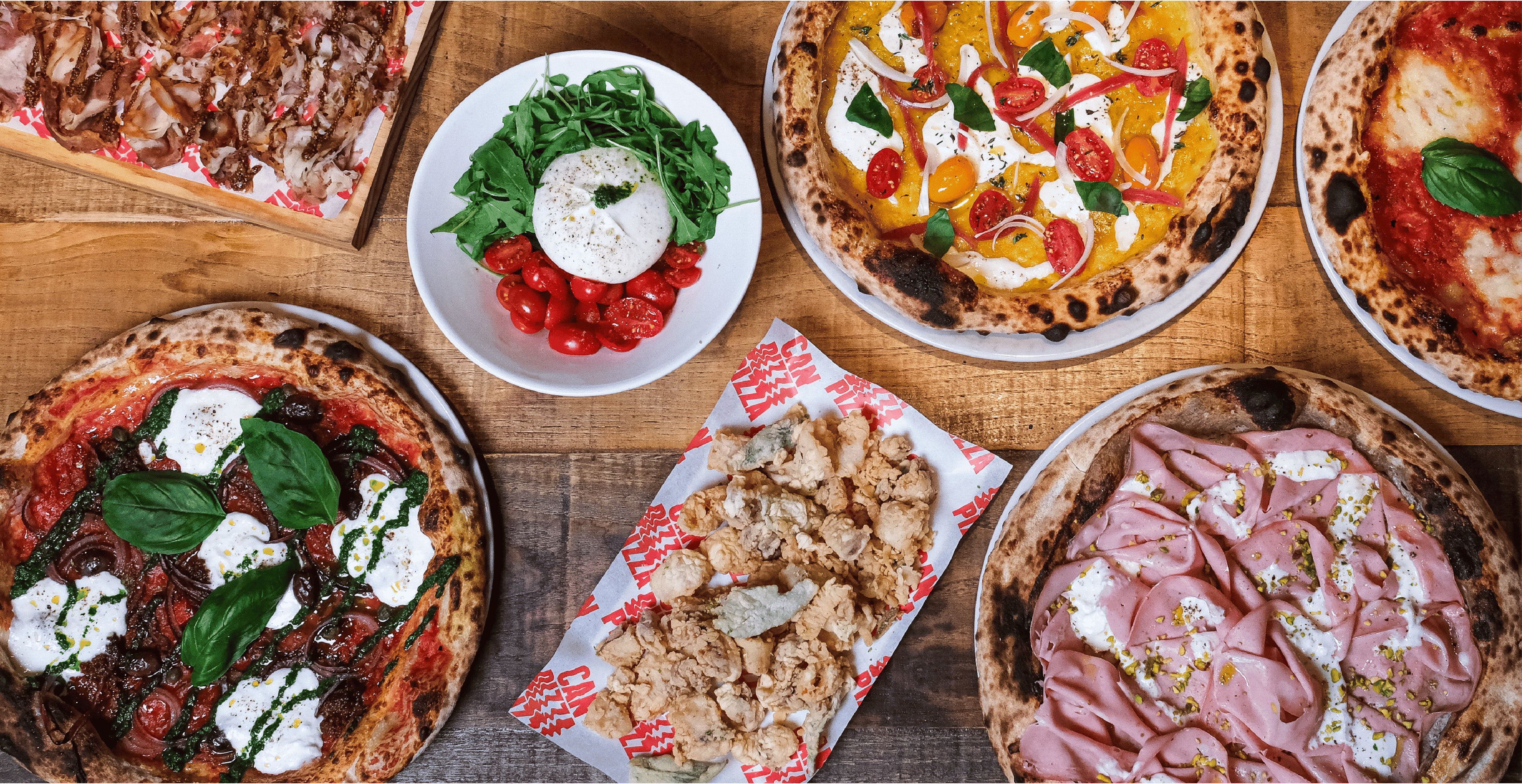Base de tomate, sobrasada, pulpo, olivas kalamata, aceite de ajo, fior di latte, orégano, tomillo, romero, hinojo, ralladura de lima y aceite de oliva.