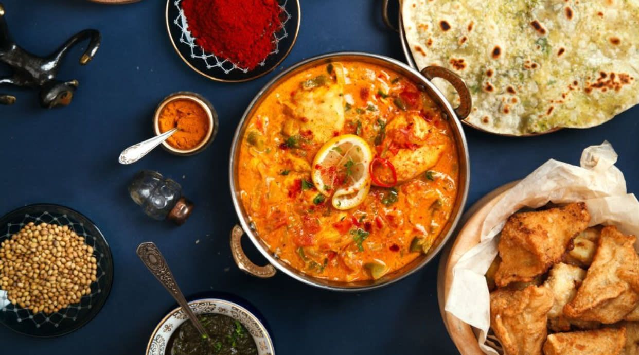 Plato estilo Bhuna con semillas de methi, cilantro fresco, tomate, medio picante