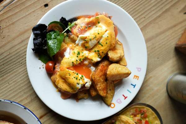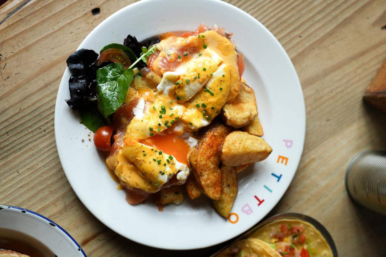 Huevos poché sobre bollo casero, salsa holandesa, ensalada, patata y bacon, pulled porc, salmón ahumado o espinacas