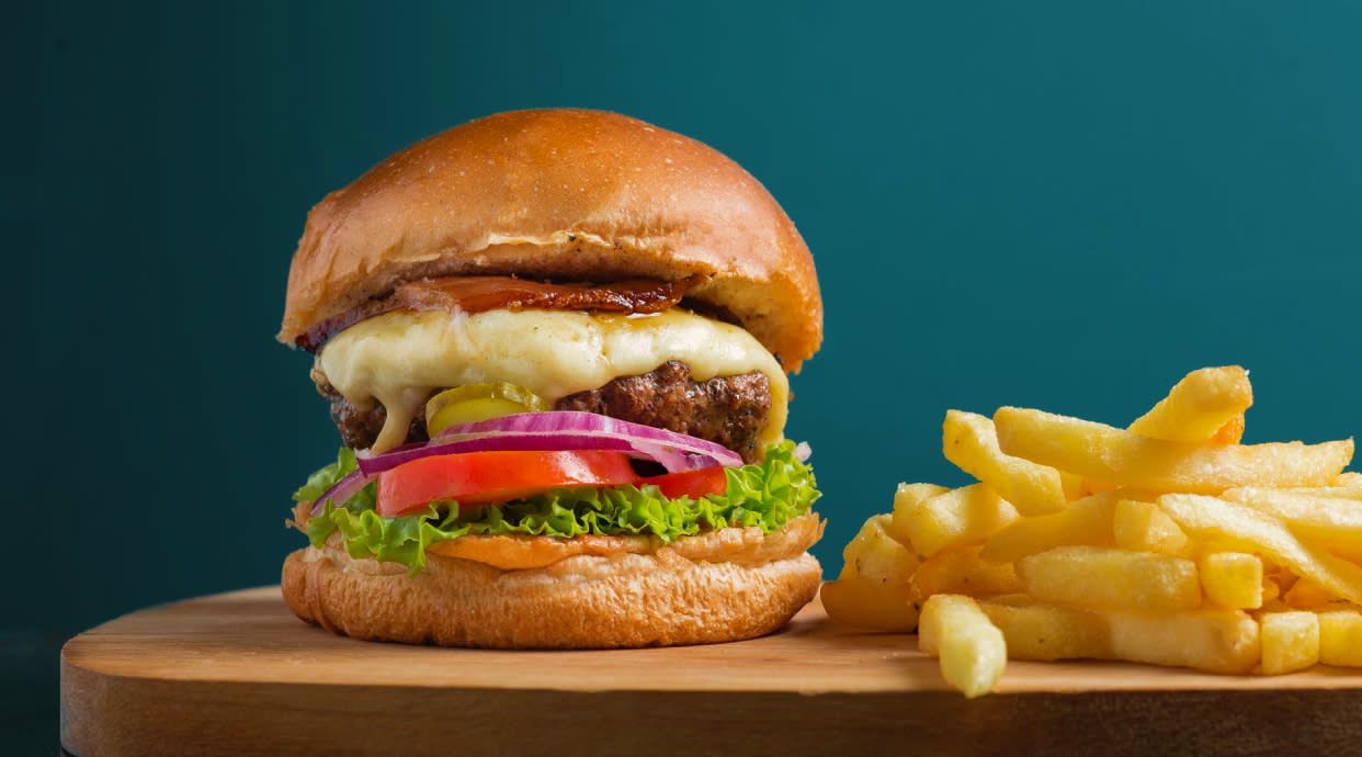 Mozzarella, cebolla caramelizada, bacon, huevo frito y patatas fritas