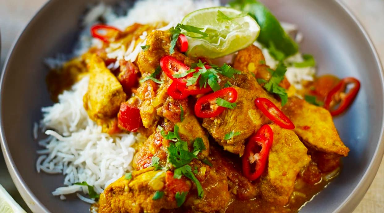 Trozos de pollo deshuesados, almendras y una salsa de masala