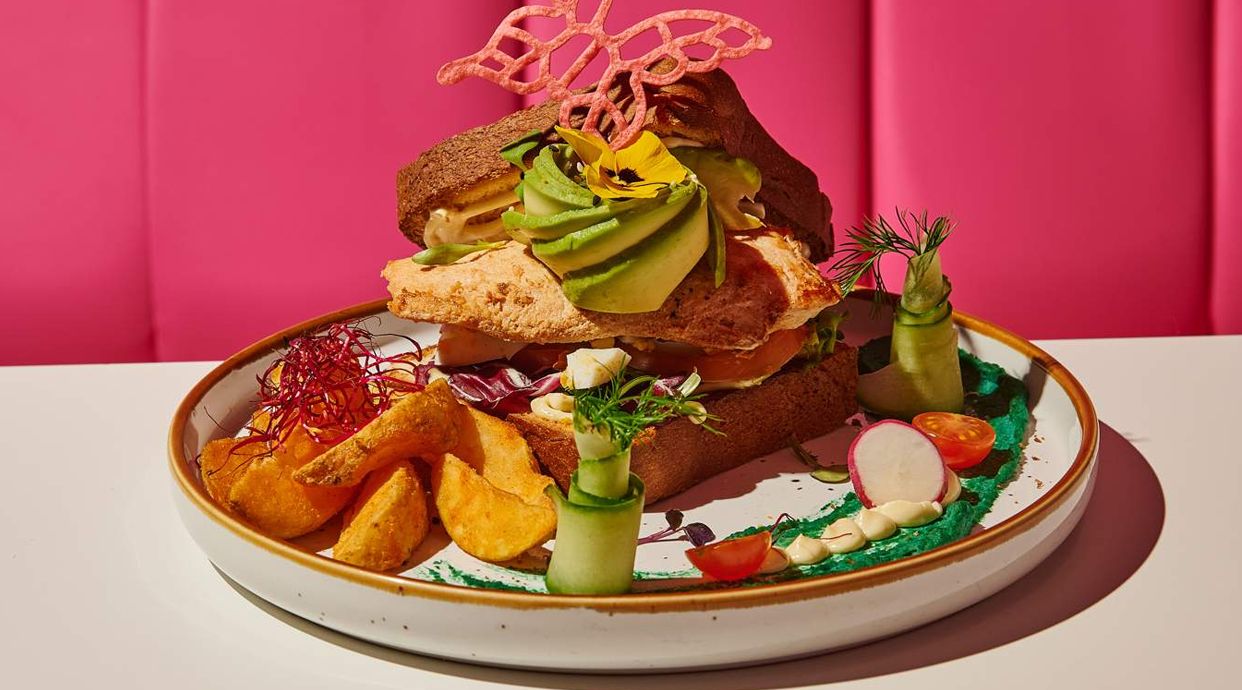 Pan brioche artesanal, pollo marinado, salsa Melrose, aguacate, tomates, ensalada, huevos duros rallados y patatas marinadas al horno