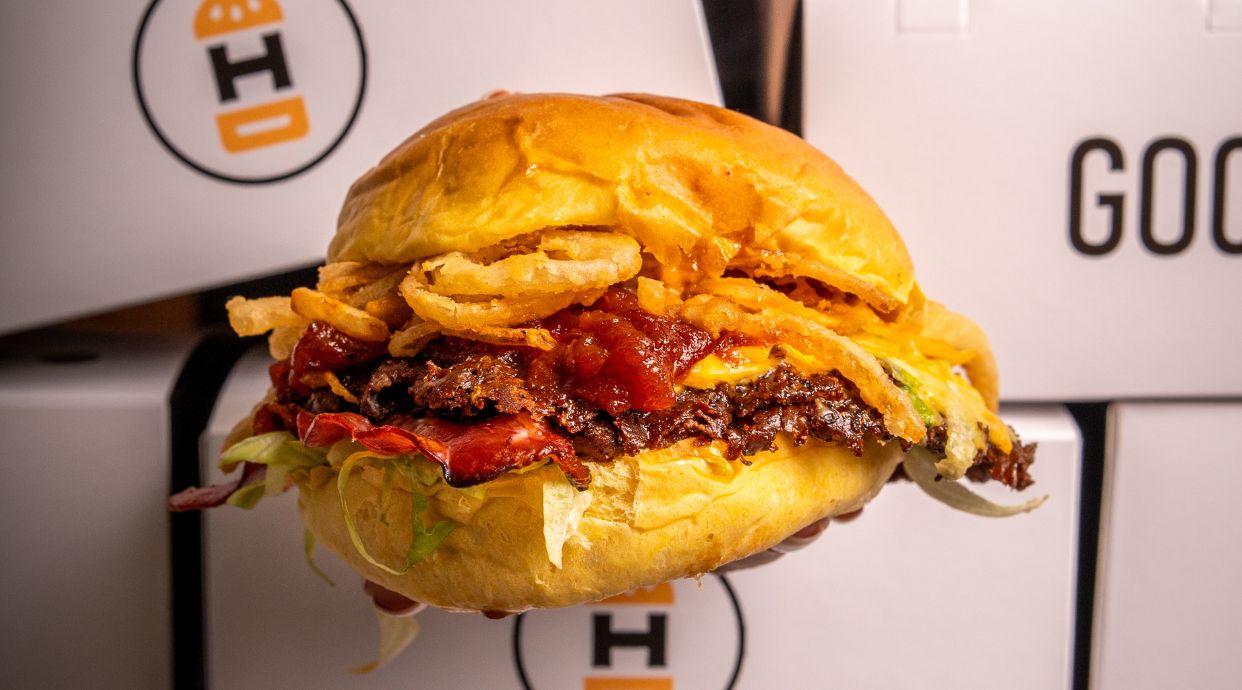 Pan brioche, doble patty carne vaca 90 gramos, queso gouda ahumado, cebolla caramelizada, bacon, salsa gocho. VIENE CON PATATAS MÍTICAS.