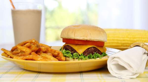 Tomate, lechuga, hamburguesa de ternera 100 % vacuno, queso emmental, kétchup y mahonesa, acompañado de patatas y bebida