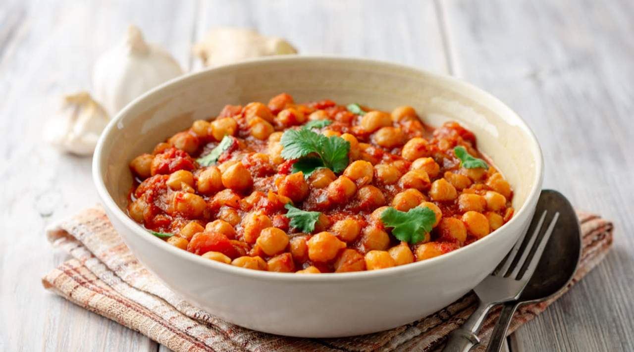Garbanzos con cebolla, tomate, hierbas y especias hindú