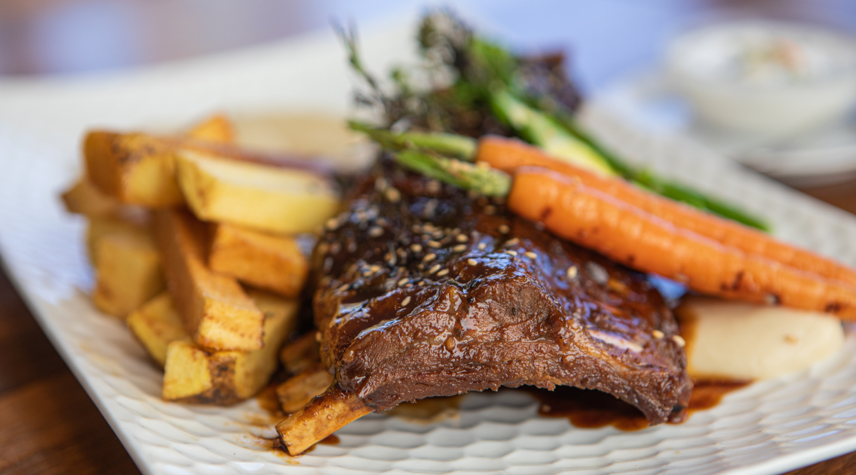 Costillas De Jabalí Asadas Al Bourbon Con Yogur Y Pepinillo Encurtido
