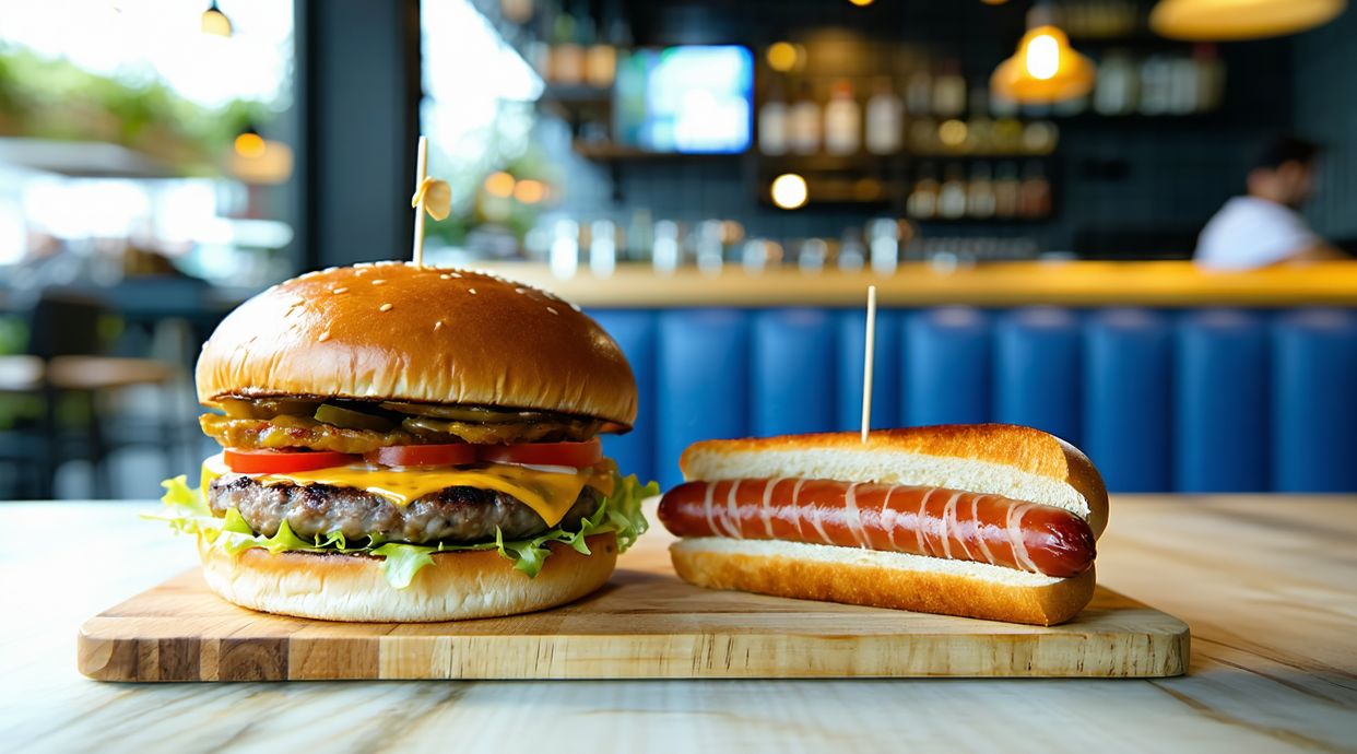 Una hamburguesa hecha con carne de vacuno de la raza angus, conocida por su sabor y terneza. Se sirve en pan con queso, tomate y una distintiva salsa de trufa