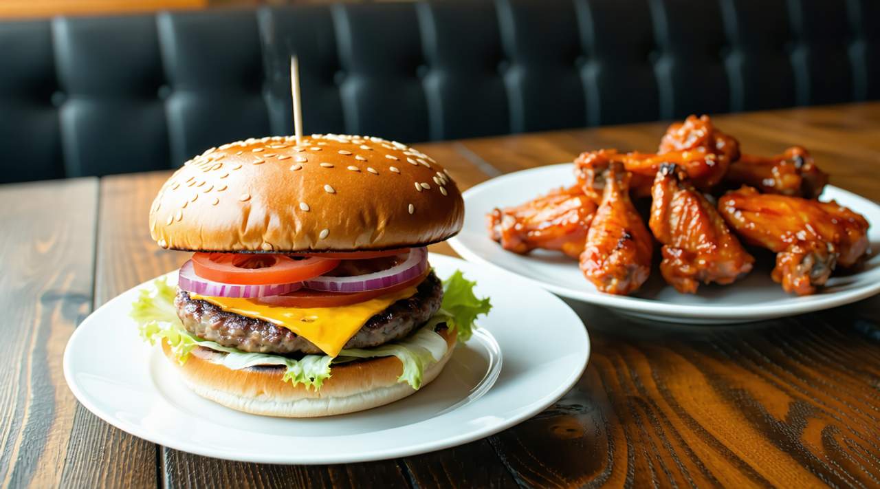 Carne de hamburguesa, filete de pollo a la BBQ, bacon, huevo, queso y patatas