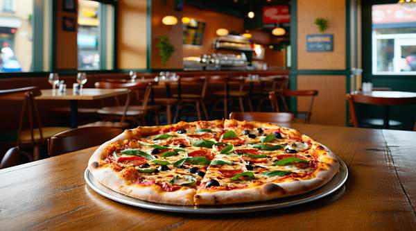Tomate, queso mozzarella, bacon, champiñones, aceitunas negras y orégano