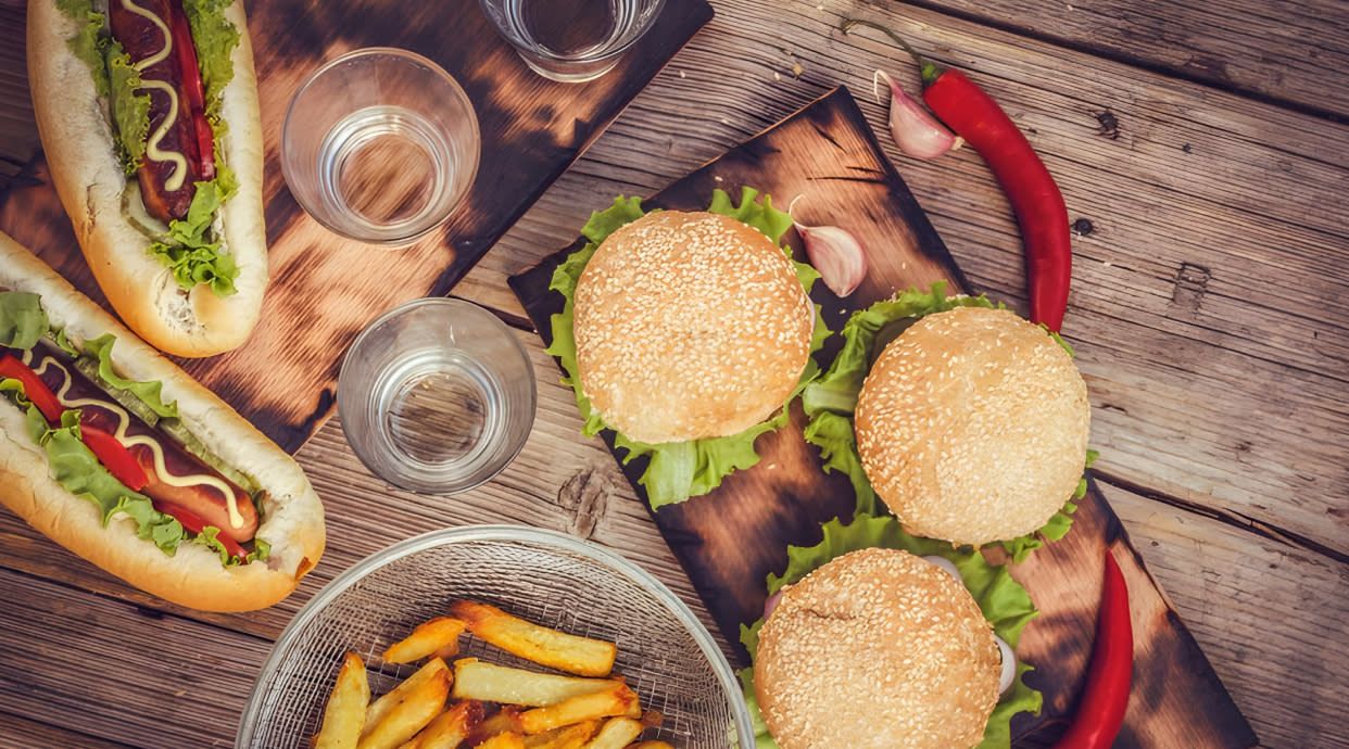 Lechuga, tomate, cebolla, queso, huevo, patatas paja, mayonesa, kétchup y mostaza