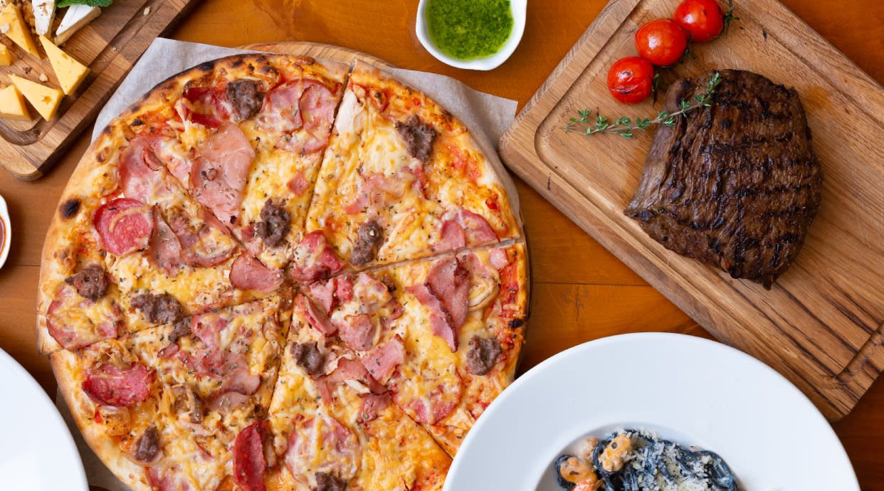 Tomate, mozzarella, orégano, bacon, salami, salchichas