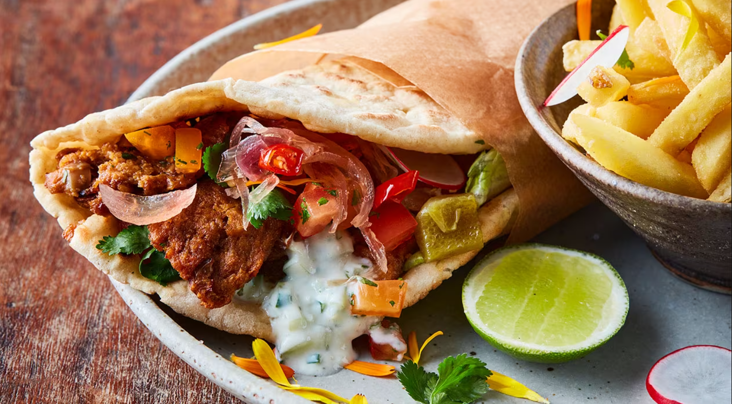 Saboree la deliciosa fusión de jugosa carne de kebab, verduras frescas y cremosas salsas envueltas en pan de pita caliente