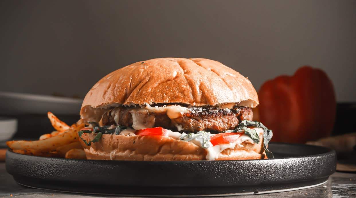 Carne 100 % de vaca (150 g.), burrata, pimiento rojo, tomate seco, salsa pesto (albahaca).