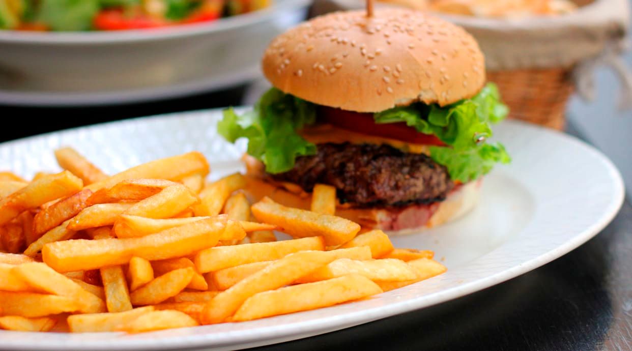 Delicioso sándwich, crujientes patatas y una refrescante bebida de 33 cl.