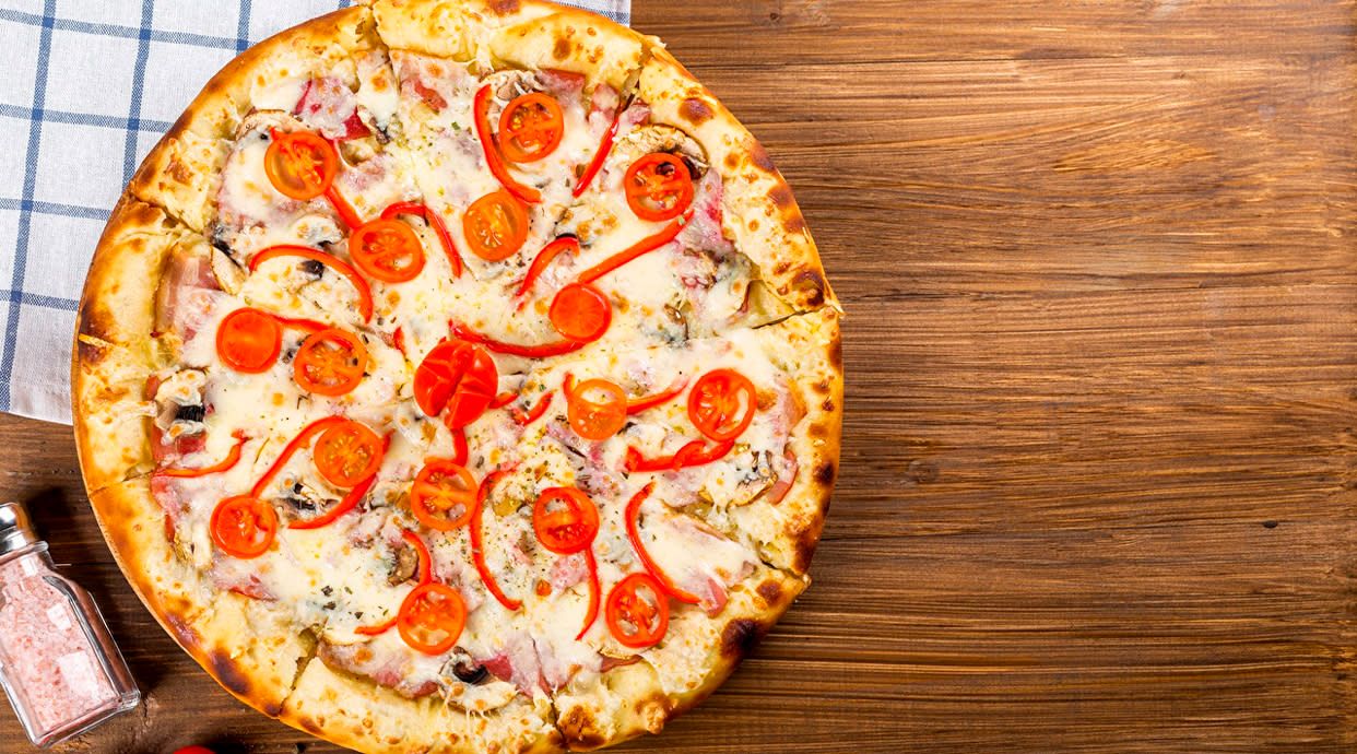 Tomate, York, bacon, atún, champiñón, pollo y ternera