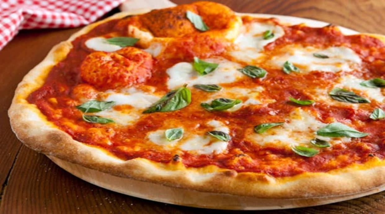 Salsa tomate, mozzarella, carne picada, cebolla orégano