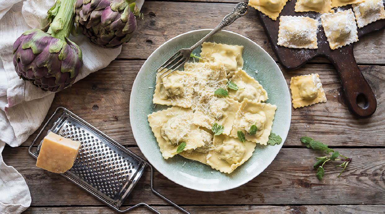 Pasta rellena de carne en salsa de champiñones, cebolla roja, parmesano y tomate