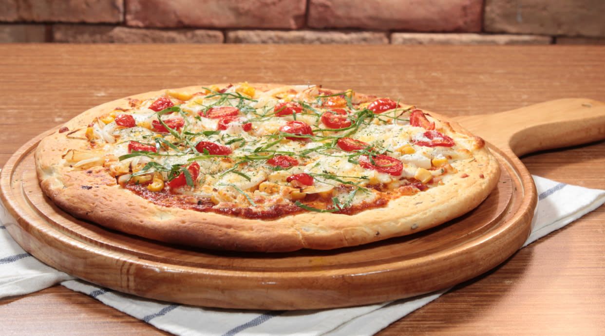 Tomate, queso, cebolla, pimiento rojo, jamón York, champiñones, chorizo picante