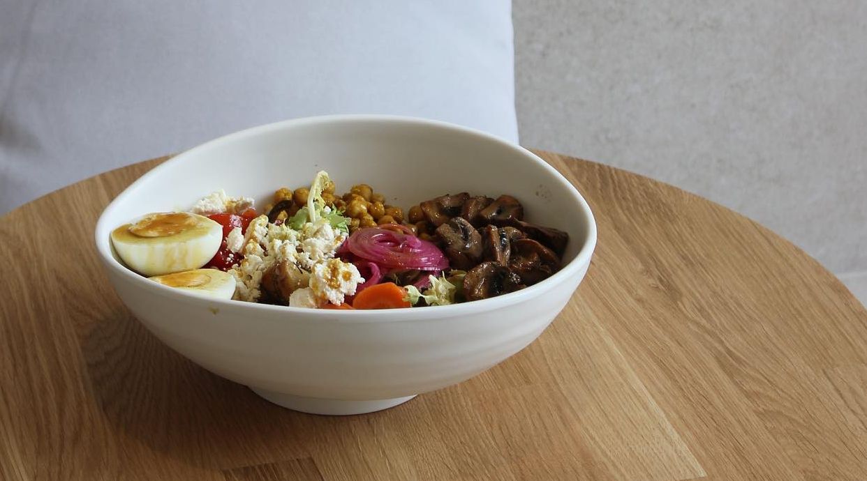 Con dados de pechuga de pollo horneada, pesto casero, queso de cabra y cebolla encurtida servido con rúcula.