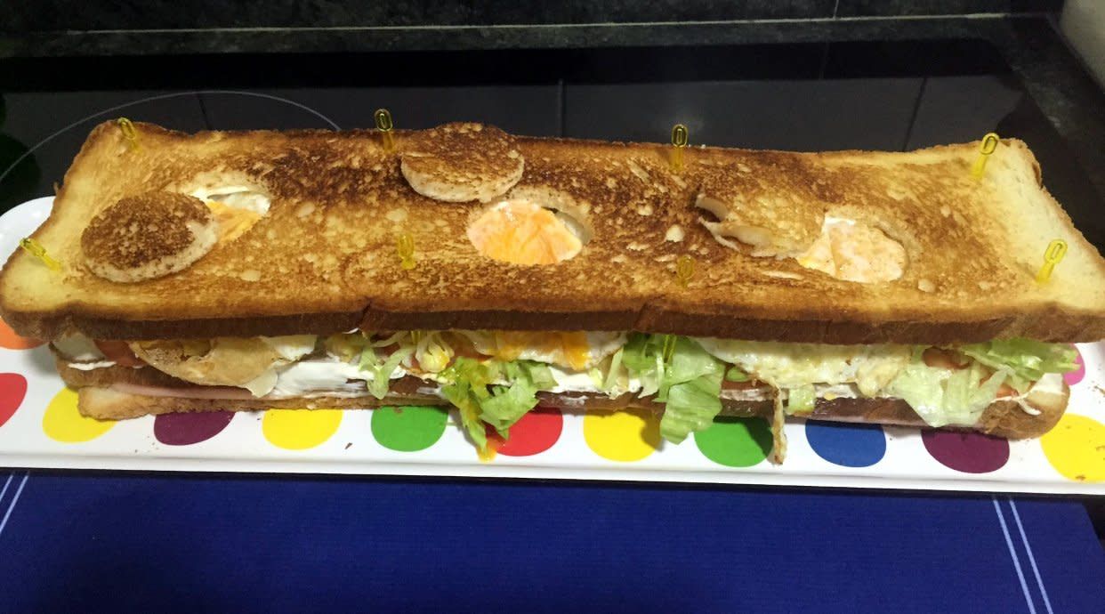 En cuatro rebanadas de pan, con jamón York, queso, salchichas, atún, huevo a la plancha, lechuga, tomate, espárragos y mahonesa