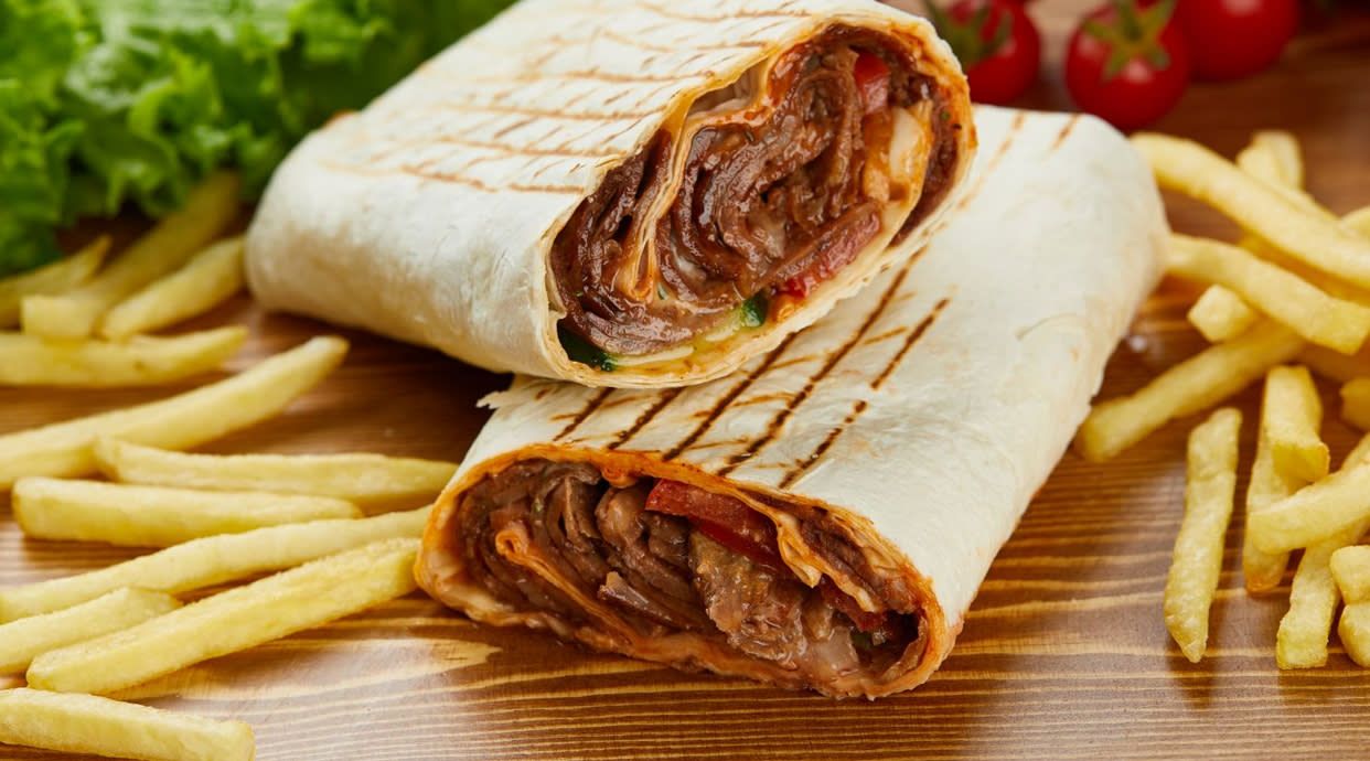 Pan de libanés, ternera, ensalada, patatas en el interior y salsas