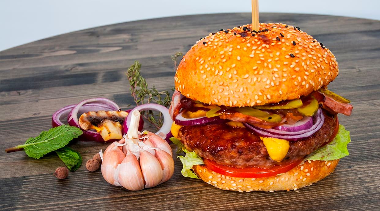 Carne de Black Angus Irlandés, cheddar, bacon, cebolla caramelizada, tomate troceado, lechuga y mayonesa
