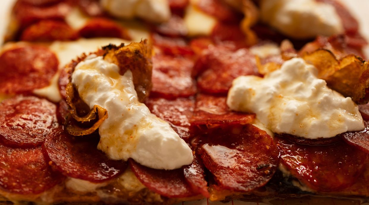 Tomate, Mozzarella Fiordilatte, Provolone, Pastrami ahumado de "Rooftop Smokehouse", olio al peperoncino y crema de pimientos asados.