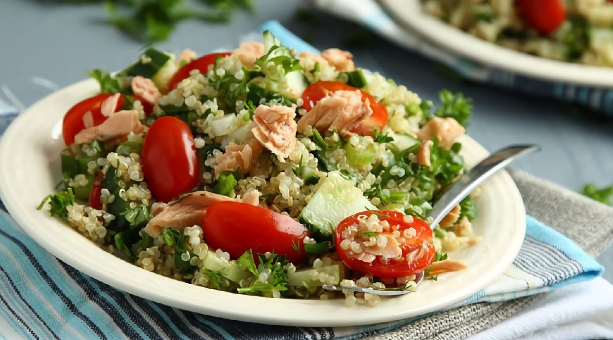 Quinoa, Lechuga, Huevo, Tomate Cherry, Aguacate, Maíz, Atún, salsa: Aceite de Oliva, Sal y Vinagre de Balsámico