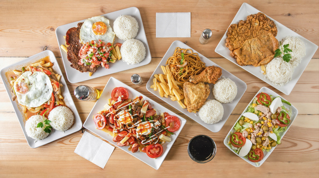 Ternera apanada y aplastada frita acompañada de arroz blanco, patatas fritas, huevo frito y ensaladilla de cebolla, tomate y pimientos picado en cubos finos