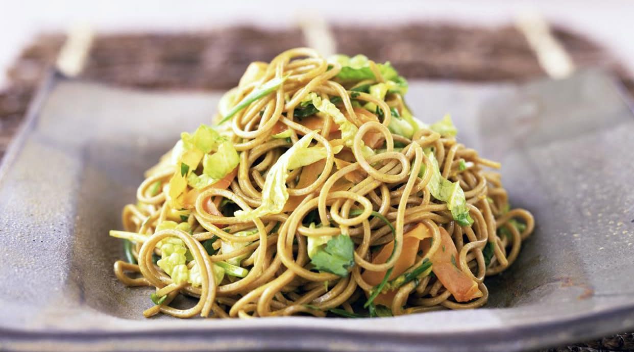 Fideo salteado con verduras y pollo con salsa teriyaki