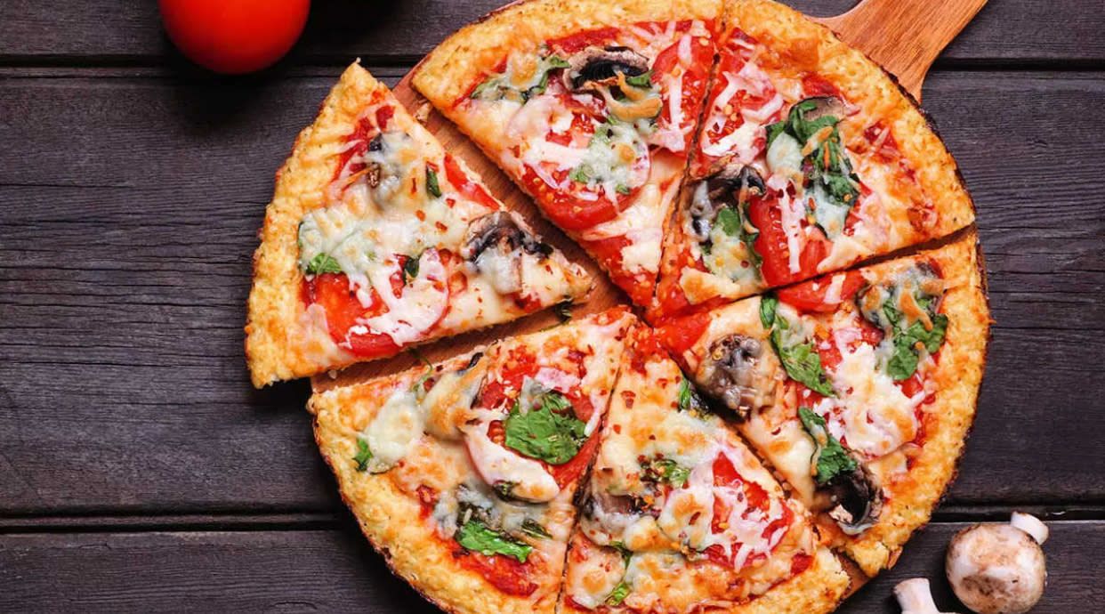Tomate, mozzarella, jamón dulce, champiñones y parmesano