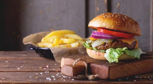 Buey a la parrilla, tomate, lechuga, cebolla deshidratada, pepinillo, bacon y queso cheddar