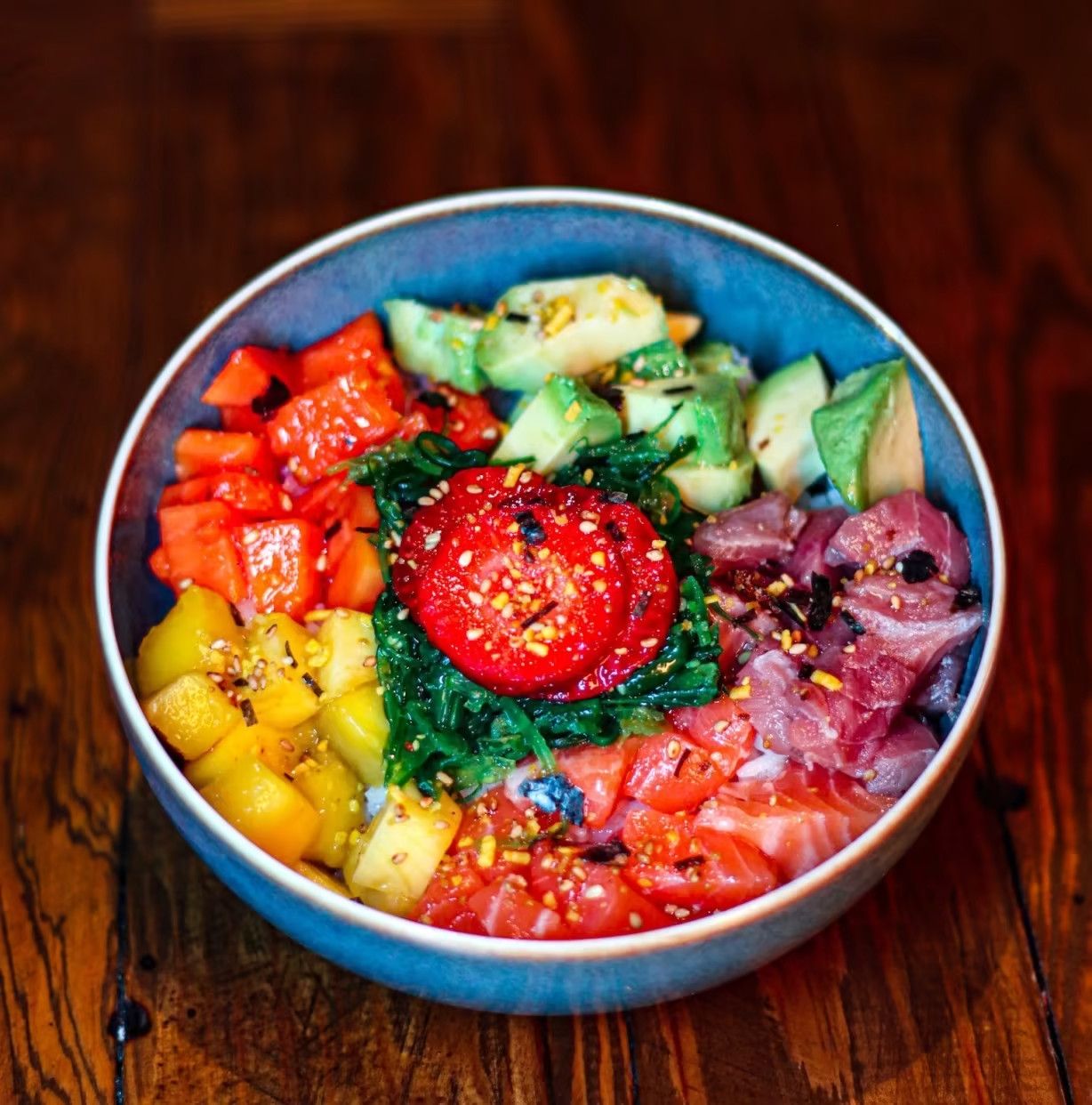 Disfruta de nuestro increíble Poke Mix. Base de arroz con salmón fresco rico en omega 3 y atún, cebolla, guacamole, wakame, semillas de sésamo y salsa spicy Mayo.