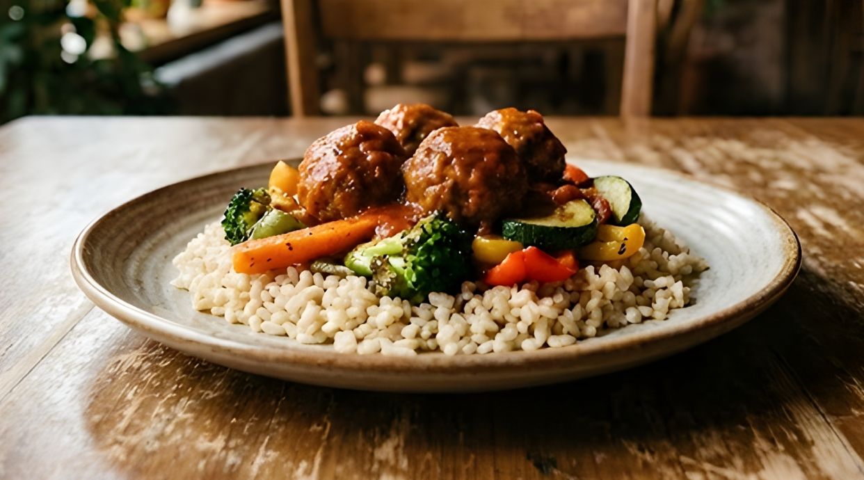Albóndigas caseras elaboradas con 100% pollo, tiernas y jugosas, condimentadas con especias suaves. Acompañadas de quinoa, ligera y nutritiva, y una combinación de verduras asadas al horno: calabacín, pimiento rojo y cebolla morada, cocinadas lentamente para potenciar su sabor natural. Un plato equilibrado, saludable y rico en proteína, ideal para el día a día. Perfecto para: comida ligera, dieta equilibrada, estilo healthy. Comida fría – Ready to heat Meal prep semanal