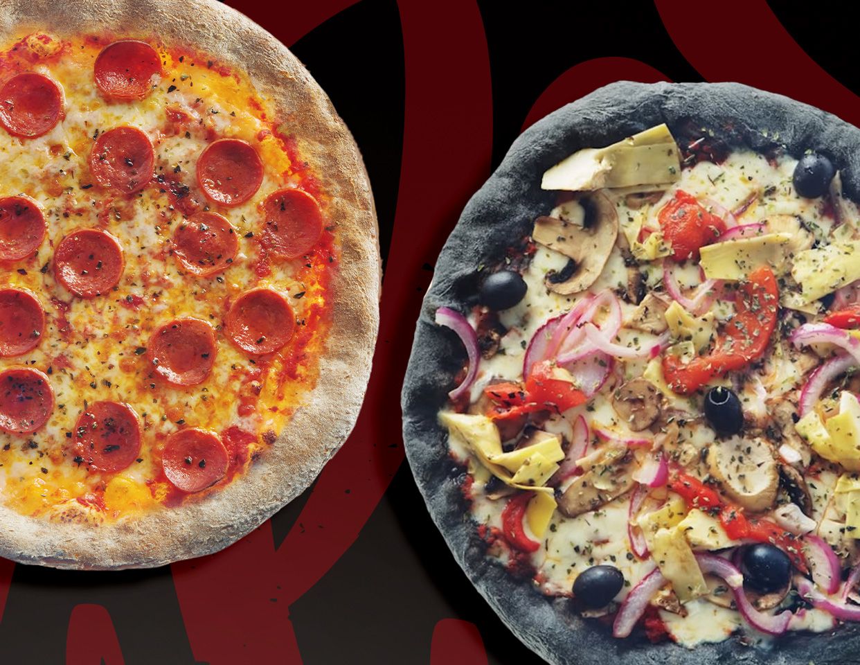 Tomate, mozzarella, champiñones frescos, cebolla, bacón, pepperoni, salsa picante y orégano.