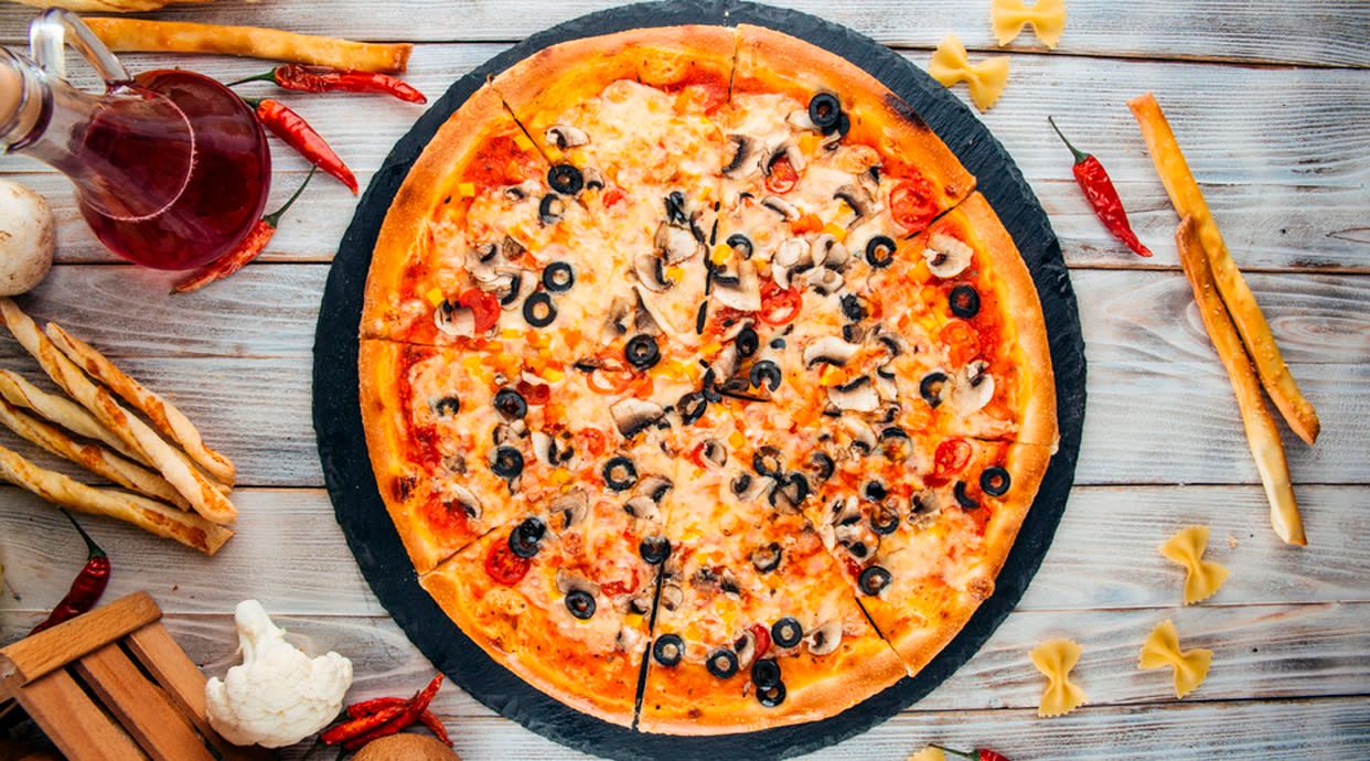 Tomate, cebolla, atún, champiñones, mozzarella y aceitunas