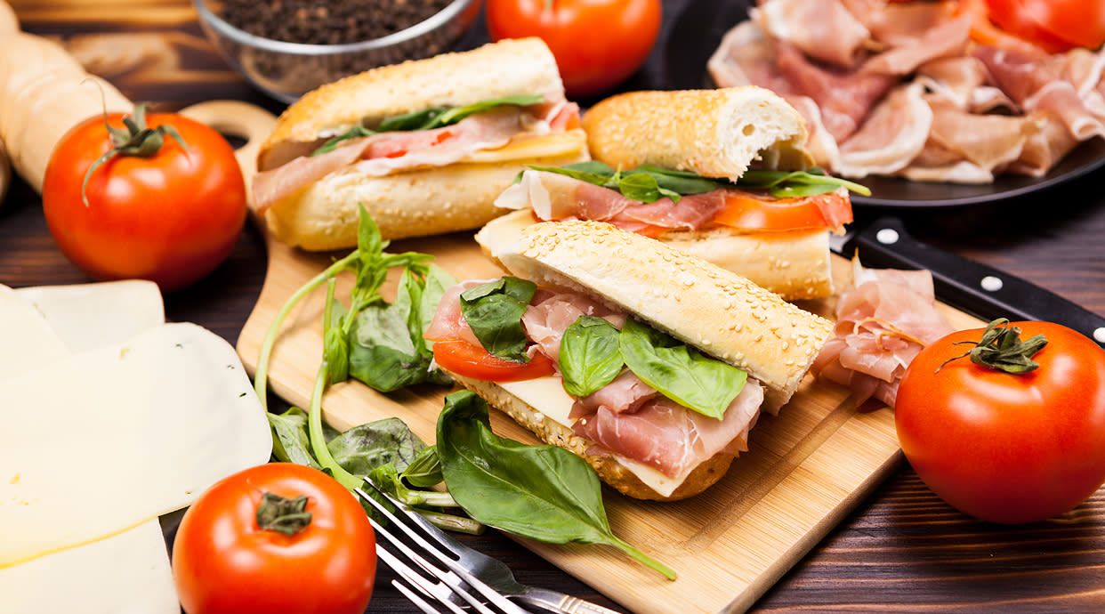 Bocadillo de pasta de pollo con lechuga, tomate y queso.