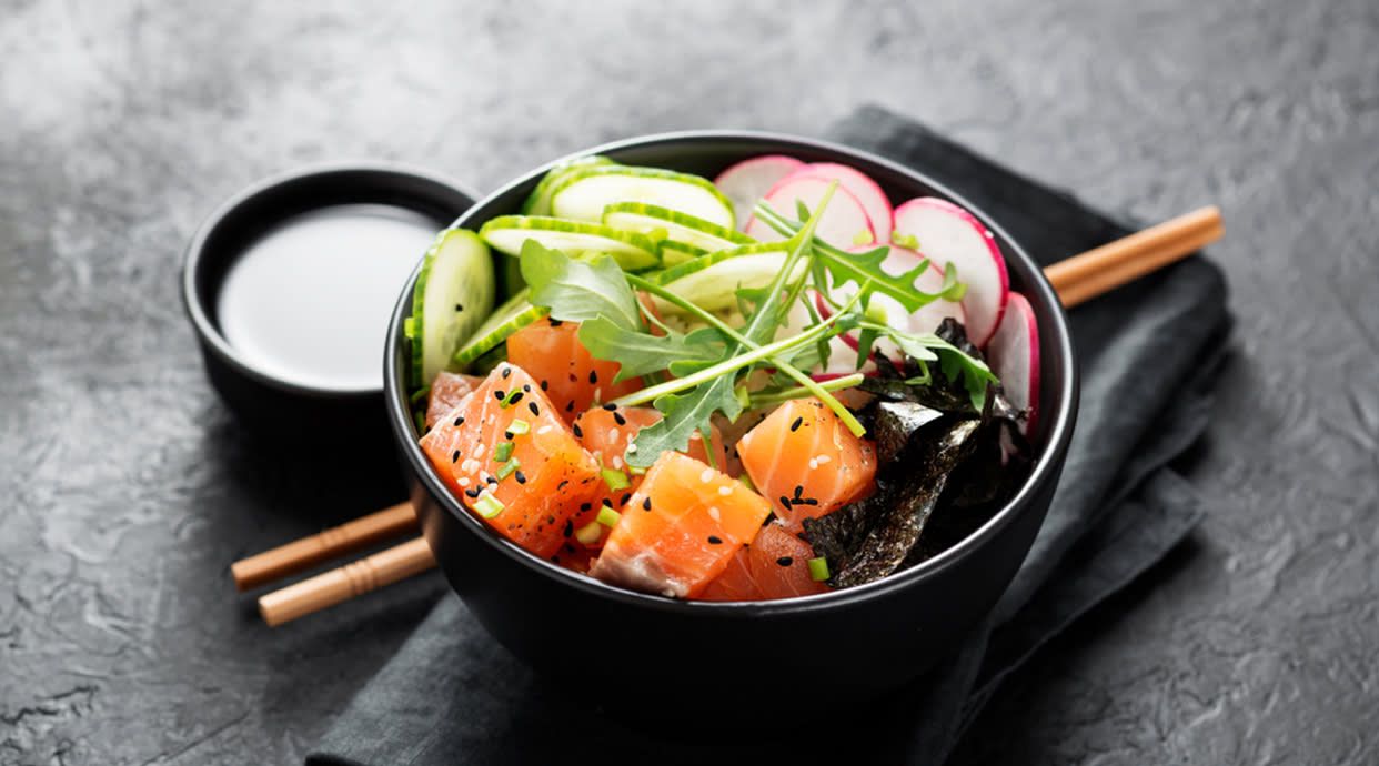 Base de arroz de sushi, atún marinado en vuelve a la vida, edamames, wakame, fruta de temporada, cebolla al limón, tomates cherrys, chips de plátano, semillas de girasol con salsa miso y sésamo