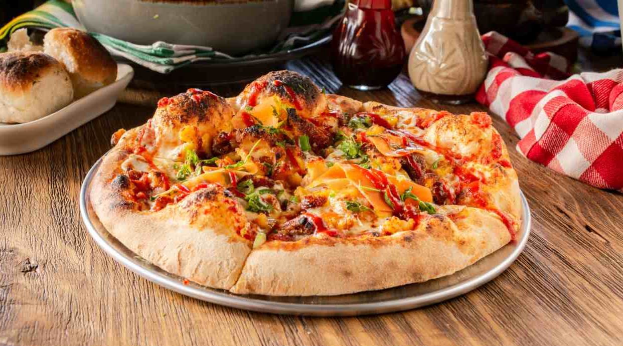 Pollo desmechado Picante, Bacon, Cebolla Roja, Salsas BBQ casera.