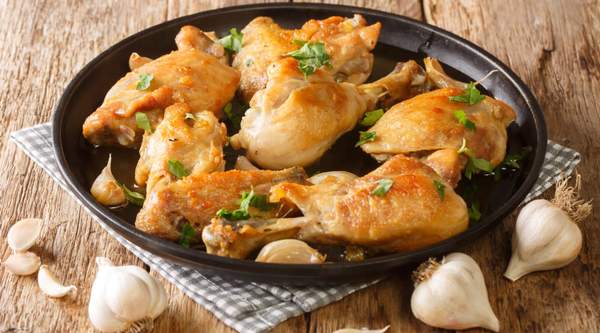 Pollo al ajillo, tierno y jugoso, cocinado con ajo, aceite de oliva y un toque de vino blanco, lleno de sabor