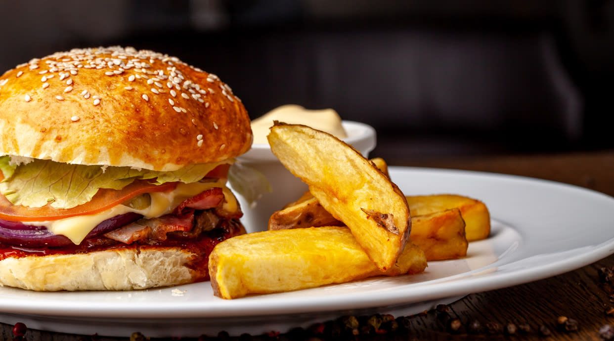 200 gramos de hamburguesa de ternera, patatas fritas y refrescos o cerveza